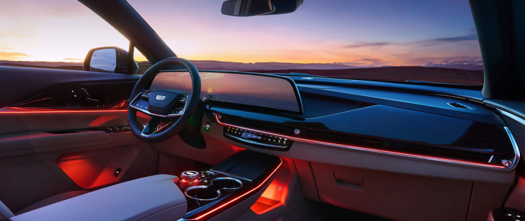 The vehicle’s exterior dimensions are 4,813 millimeters in length, 1,903 millimeters in width, and 1,686 millimeters in height (1,682 mm for the base trim level), with a wheelbase of 2,857 millimeters. These dimensions ensure interior space performance, particularly regarding longitudinal legroom in the second row. In its standard configuration, the cargo compartment offers 584 liters of capacity with a regular layout. The rear seats can be electronically folded in a 40/60 split, and when folded down, they form a nearly flat surface with the cargo floor, expanding the maximum loading volume to 1,634 liters. This practicality aligns with the vehicle’s positioning. The exterior design continues Cadillac’s “Art and Science” design language with diamond-cut motifs, but the lines are more fluid and rounded. The signature vertical “Starfall” LED headlights and vertical “Light Blade” LED taillights create distinct brand identity features.